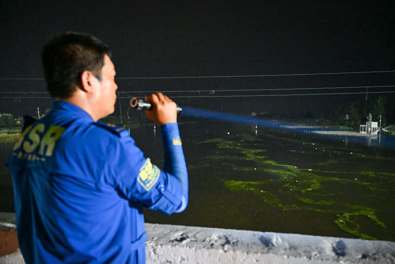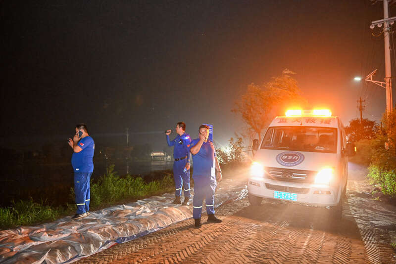 ↑8月4日,在大清河天津静海段北堤,天津静海蓝天救援队队员夜间巡堤时发现隐患点后,通过灯光指引与对讲机呼话和南堤队员协同处理。