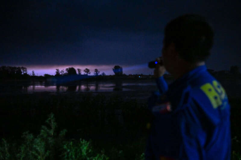 ↑8月4日,在大清河天津静海段北堤,天津静海蓝天救援队队员夜间巡堤时发现隐患点后,通过灯光指引南堤队员现场查看。