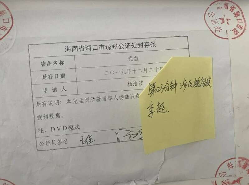 杨浩波2019年在公证处公证的视频中表示,他不认识魏福良和毛建,借款2000余万元给他的是海南省纪委干部李超。