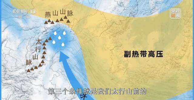 中国水利水电科学研究院正高级工程师 刘家宏:这一次暴雨的形成主要是三个条件。第一个条件是“杜苏芮”台风,带来了非常充沛的水汽。第二个条件,是副热带高压的阻挡。第三个条件,就是我们太行山前的地形的抬升作用。这三个条件正好相遇在了一起,就形成了这次的特大暴雨。