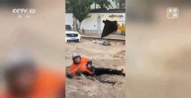 当有人注意到这位快递员时,情况已经十分危急。他被山洪冲倒,摩托车压在了腿上,根本无法动弹。身后湍急的防洪沟,水位正在疯涨。救援人员连忙调来推土机,为快递员套上绳索后,推开了摩托车。