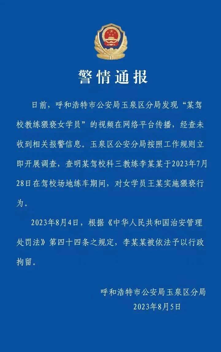 中新网8月5日电 据呼和浩特市公安局官方微信消息,日前,呼和浩特市公安局玉泉区分局发现“某驾校教练猥亵女学员”的视频在网络平台传播,经查未收到相关报警信息。玉泉区公安分局按照工作规则立即开展调查,查明某驾校科三教练李某某于2023年7月28日在驾校场地练车期间,对女学员王某实施猥亵行为。