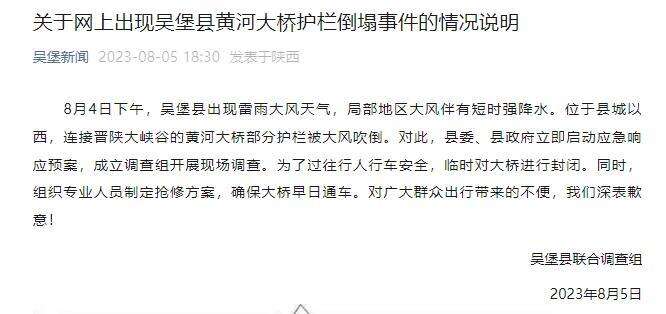 中新网8月6日电 据“吴堡新闻”微信公众号6日消息,就位于陕西省吴堡县县城以西,连接晋陕大峡谷的黄河大桥部分护栏被大风吹倒一事,吴堡县联合调查组近日发布情况说明。目前,吴堡县县委、县政府已启动应急响应预案,成立调查组开展现场调查。为了过往行人行车安全,临时对大桥进行封闭。同时,组织专业人员制定抢修方案,确保大桥早日通车。