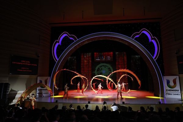 8月6日晚,由国家体育总局主办的“中华体育精神颂”成都大运站中国功夫专场展演暨优秀运动员交流活动在大运村艺术中心举行。来自成都体育学院等6所四川高校的240余名学生参演,他们以饱满的精神状态和精湛的功夫技艺,为观众呈现了“狮跃龙腾”“武韵”“峨眉武魂”“源远流长”等节目。