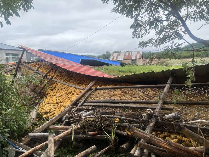 用于储存玉米的简易活动房被洪水冲倒。中青报·中青网记者 王姗姗/摄