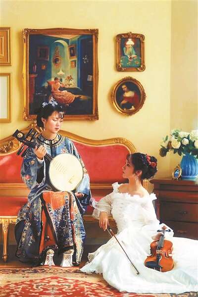 金框蓝色油画、金边红绒沙发,仿佛上世纪欧洲贵族豪宅。乌拉身着蓝色绣衣,抱着月琴端坐于沙发凳上,向左微微低头,眼神略带几分哀怨;小温暖则是穿着婚纱跪坐于地面,将小提琴放在宽大的白色裙摆上,抬头望向右前方,神采奕奕地与乌拉对视。
