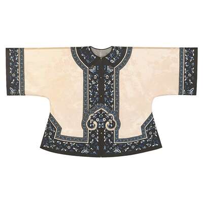 陈润熙曾就读于服装专业,因为偶然的契机,他开始热衷收藏清代古董衣。他曾花费近万元拍卖到一件晚清时期女性穿着的对襟褂子。衣服的两边有如意头,绣着“三多”(石榴、桃子、佛手)等,寓意多子多寿多福。而繁复的刺绣工艺是清朝晚期服饰的重要特点,这件衣服的最精美处在于挽袖和镶边刺绣。