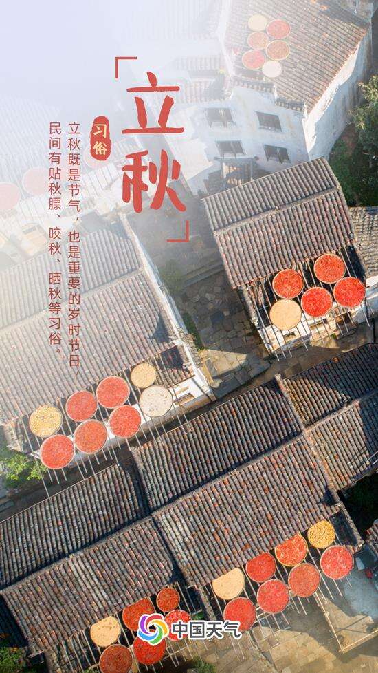 在我国不少地方还流行“咬秋”,人们会在立秋日吃瓜,意在借西瓜、香瓜等瓜果祛除暑日积蓄在体内的暑气。在湖南、江西、安徽等地的山区村民,每到立秋时,还会利用房前屋后及自家窗台、屋顶架晒或挂晒农作物,以此庆祝丰收。