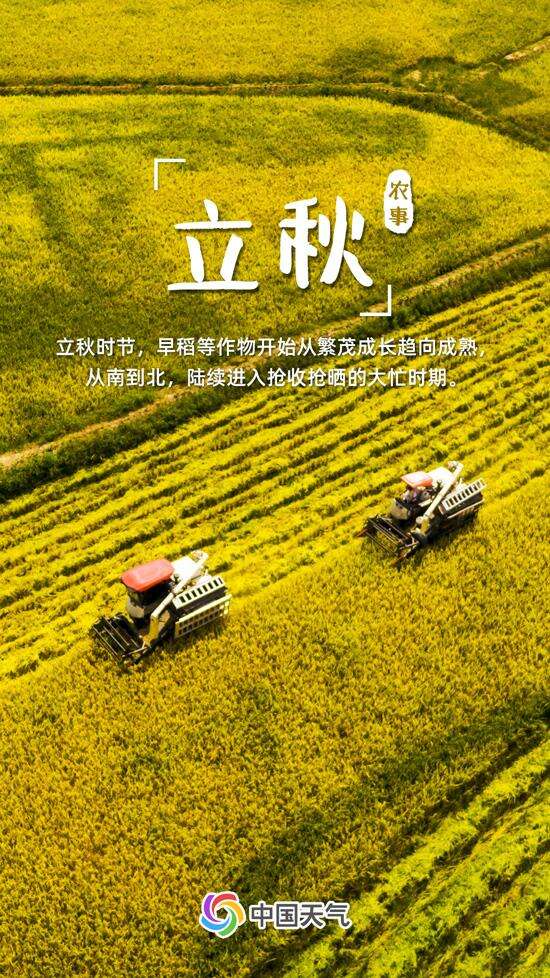 随着暑热的下沉和收敛,自然万物从繁茂趋向成熟,立秋时节,早稻等作物开始成熟收获,从南到北,陆续进入抢收抢晒的大忙时期。