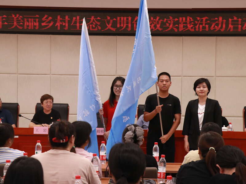 在“走进京郊大地 建功美丽乡村”北京青年美丽乡村生态文明创效实践活动启动仪式上,团北京市委副书记钟棉棉为“青振京郊”乡村振兴青年志愿服务队授旗。受访者供图。