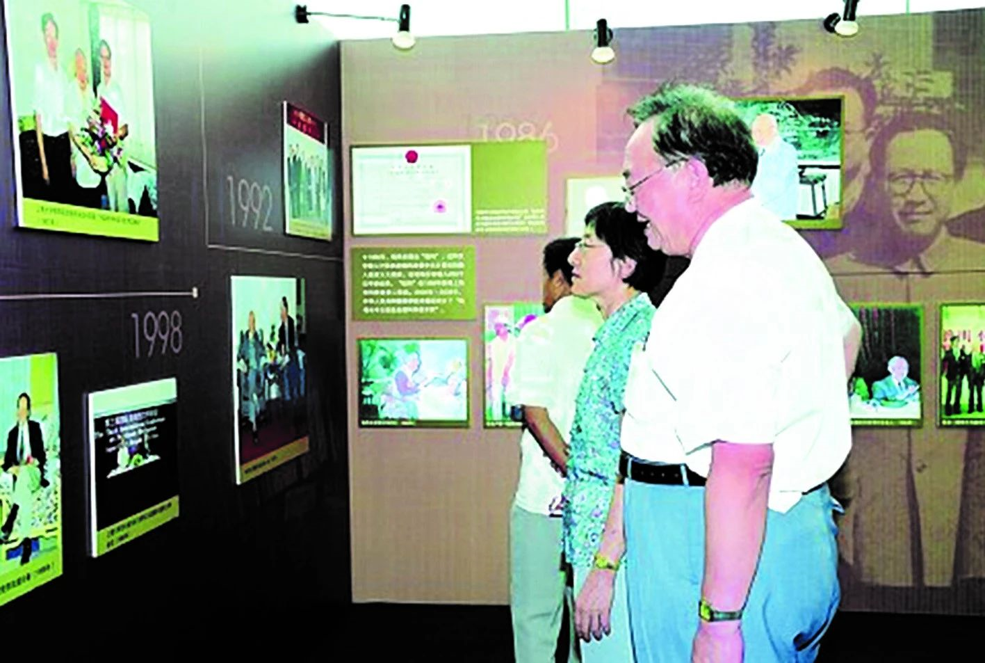 图4 2008年8月13日,上海大学教授戴世强在上海书展参观“我国著名的科学家、教育家、社会活动家——钱伟长院士”主题馆