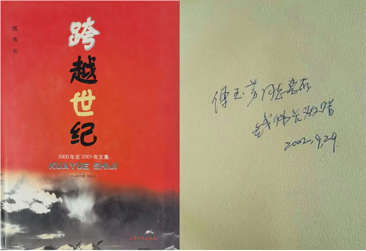 图7 钱伟长为《跨越世纪——2000年至2001年文集》责任编辑傅玉芳签名