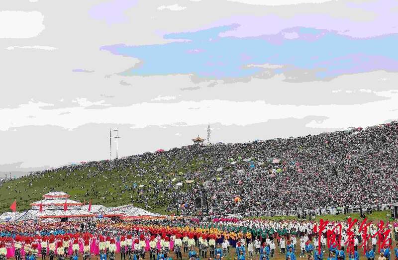 主会场当周草原上,身着盛装的各族群众载歌载舞,汇聚成一片欢乐的海洋。上午10时,庆祝大会开始。