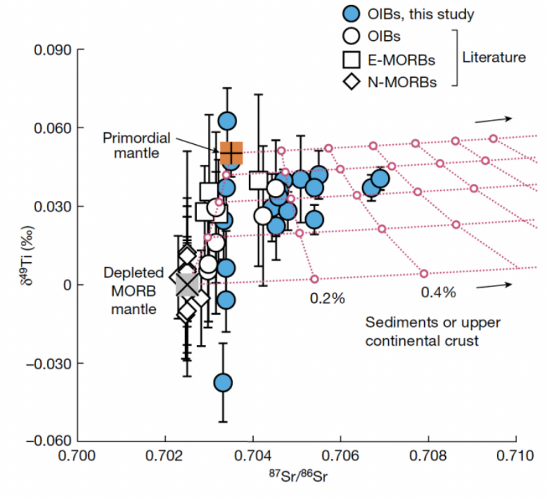 图3: 现代洋岛玄武岩和大洋中脊玄武岩的钛稳定同位素和锶同位素组成。可见其钛稳定同位素组成的变化无法单纯由沉积物或大陆地壳物质的再循环导致。