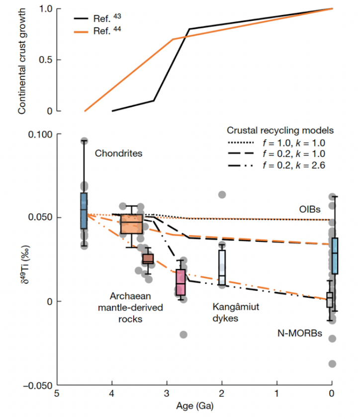 图2: 大陆地壳生长模型和地球地幔来源火成岩的钛稳定同位素组成随时间的演化。