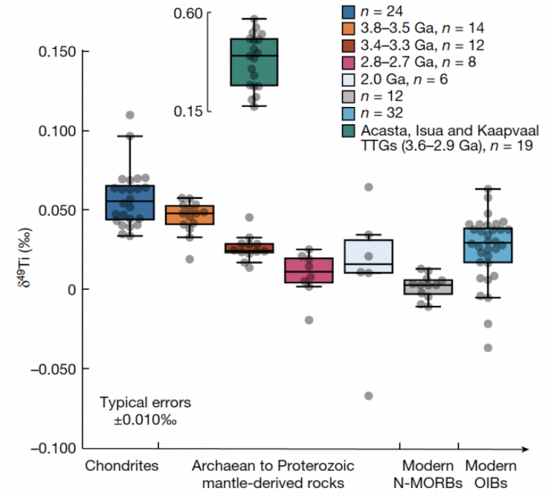 利用新的分析方法,邓正宾等人首先对24件球粒陨石样品的钛同位素进行了标定,确定全硅酸盐地球的钛稳定同位素组成和现在的上地幔存在显著差别。在此基础上,对比研究了全球从太古代到元古代(38亿年-20亿年以前)的地幔来源火成岩以及现代洋岛玄武岩样品。结果发现早太古代(38亿年-35亿年)的样品和球粒陨石的钛稳定同位素组成一致;在35亿年到27亿年之间地球地幔来源火成岩样品的同位素组成随着时间逐渐变轻,直到与现代普通型大洋中脊玄武岩接近;而现代洋岛玄武岩的钛稳定同位素组成与大洋中脊玄武岩存在差别,更接近全硅酸盐地球的组成特征(图1)。