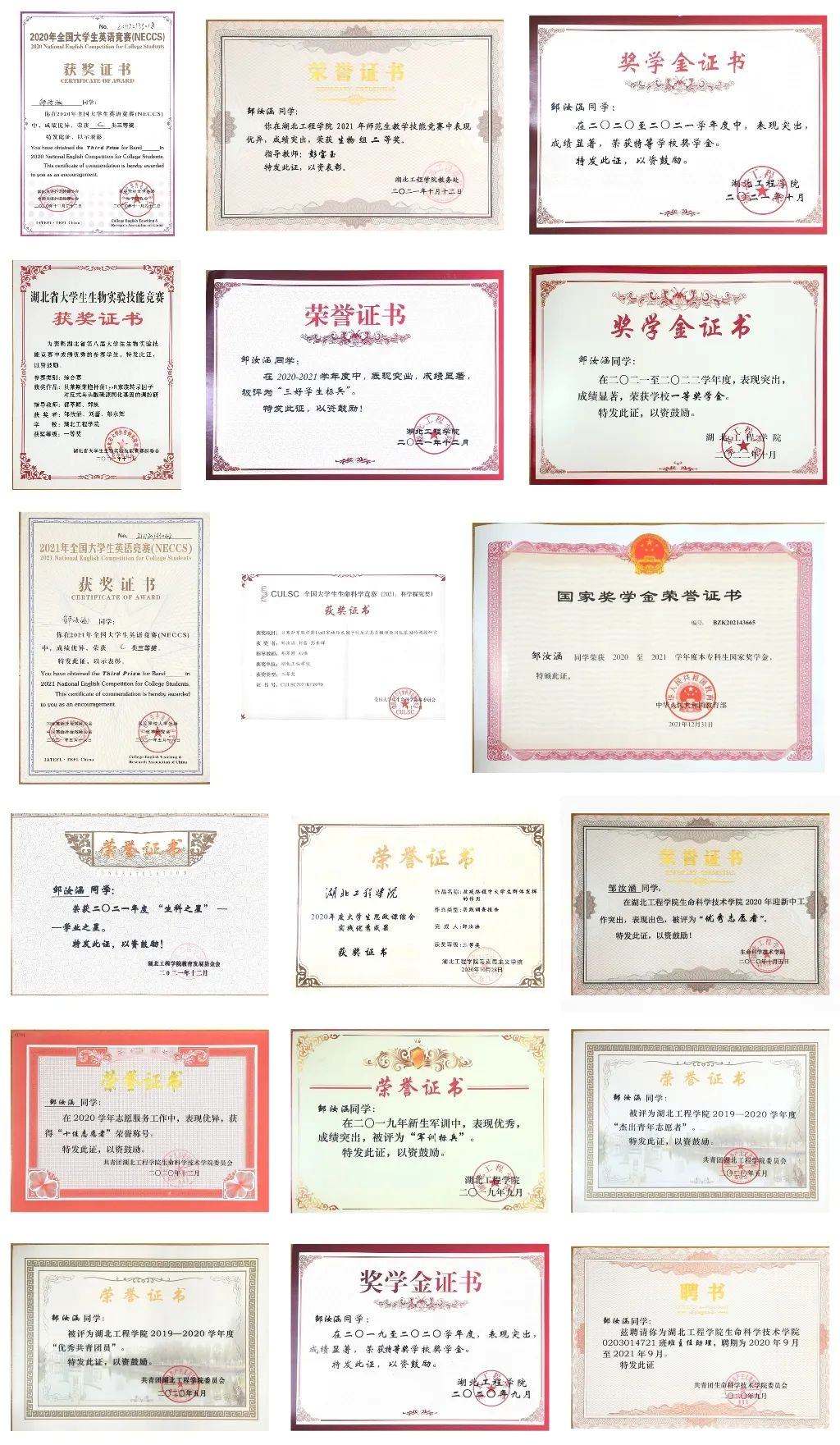 (邹汝涵获得的部分证书)