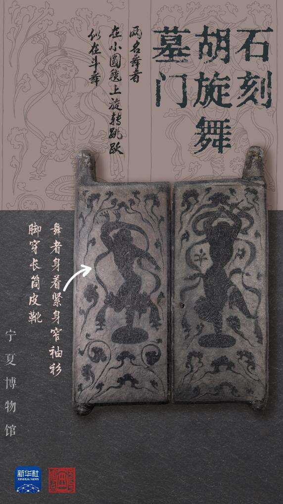 石刻胡旋舞墓门由两扇石门组成,门扇正面凿磨光滑,用浅浮雕手法分别刻画了一位矫健奔放的男性舞者,两人都手举长巾,熟练地挥旋舞动。四周浅浮雕卷云纹,使舞者犹如腾跃于云气之中,形成流动如飞的艺术效果。胡旋舞是西域的一种舞蹈,经丝绸之路传入中原,盛行于唐。宁夏博物馆副研究馆员母少娟表示,石刻胡旋舞墓门不仅将史料中记载的“胡旋舞”以实物形式展现,也为粟特人沿丝路一线徙居宁夏的事实提供了佐证,这是丝路文化的结晶,也是民族迁徙与融合的体现。