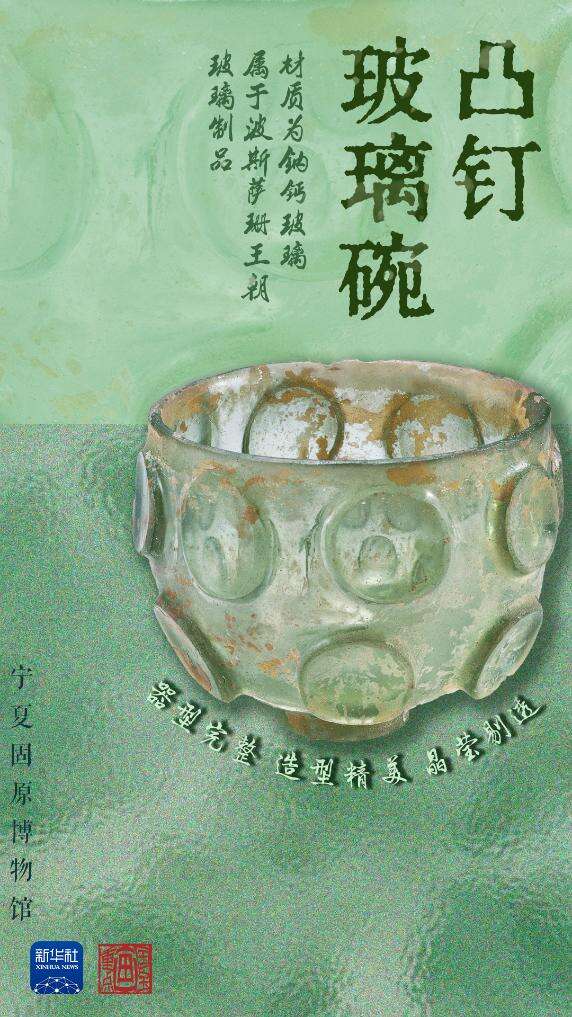 不同于我国古代的铅钡玻璃,这件出土于宁夏固原的凸钉玻璃碗的材质是钠钙玻璃,是经丝绸之路远道而来的“进口货”——波斯萨珊王朝玻璃制品。据张强介绍,这只玻璃碗体现了萨珊玻璃器形和纹饰上的独特风格以及精湛的磨琢工艺,是我国出土的萨珊玻璃器的代表,说明当时西方玻璃器经丝绸之路输入中国,也反映出固原作为丝绸之路东段北道的必经之地,在当时国际商业贸易和文化传播中的重要地位。