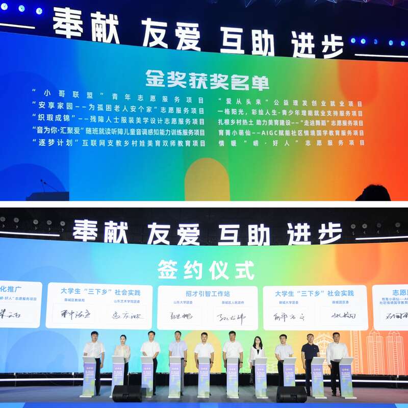闭幕式上,现场公布了本届大赛的获奖名单,并为获奖项目代表进行颁奖,日照市五莲县义工协会“爱从头来”公益理发创业就业项目作为获奖代表发言。山东大学、山东艺术学院、聊城大学、育菁小萌仙——AIGC 赋能社区情境国学教育服务项目、情暖“崂·好人”志愿服务项目与团薛城区委等相关单位签约,进一步推动优秀志愿服务项目落地开花。