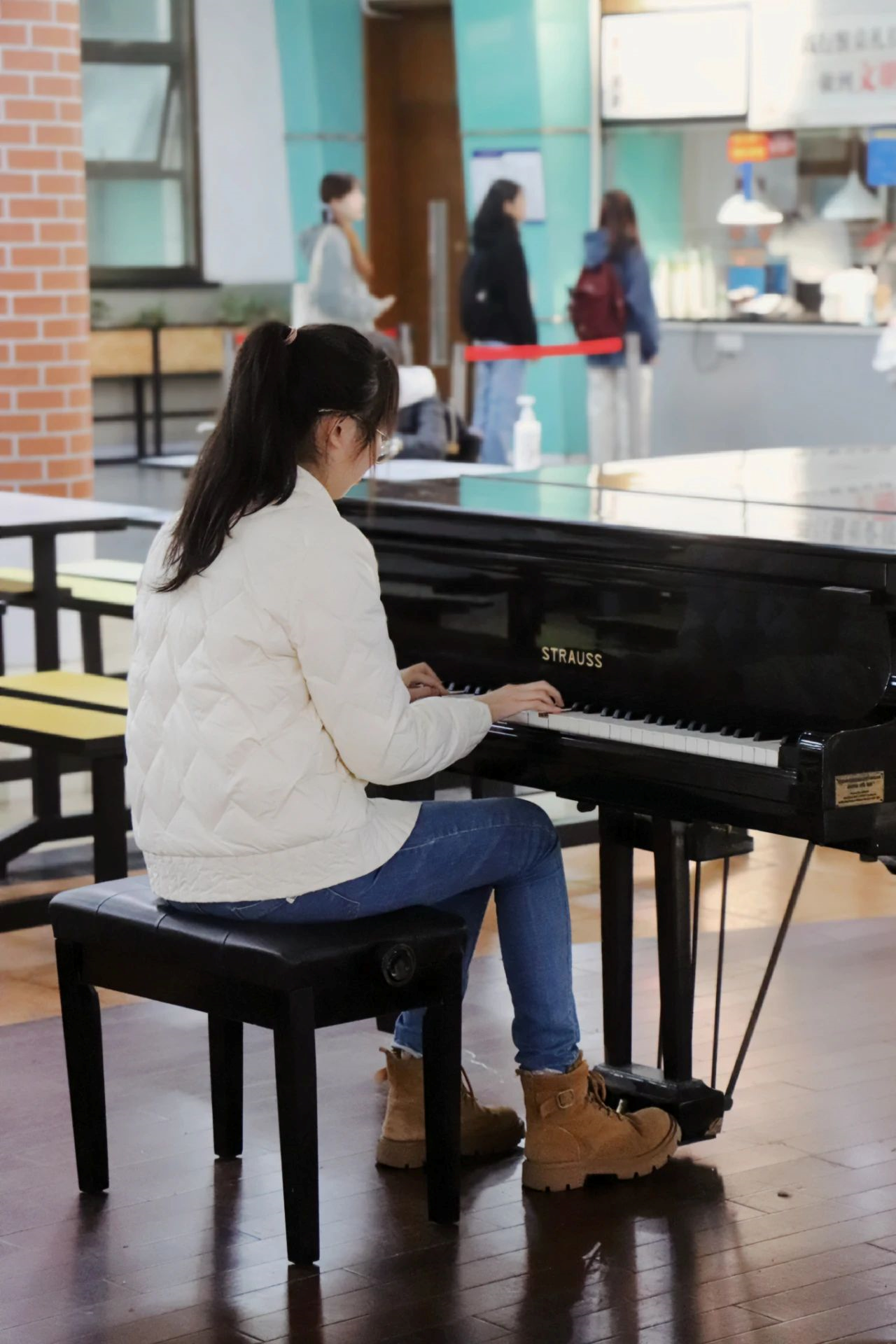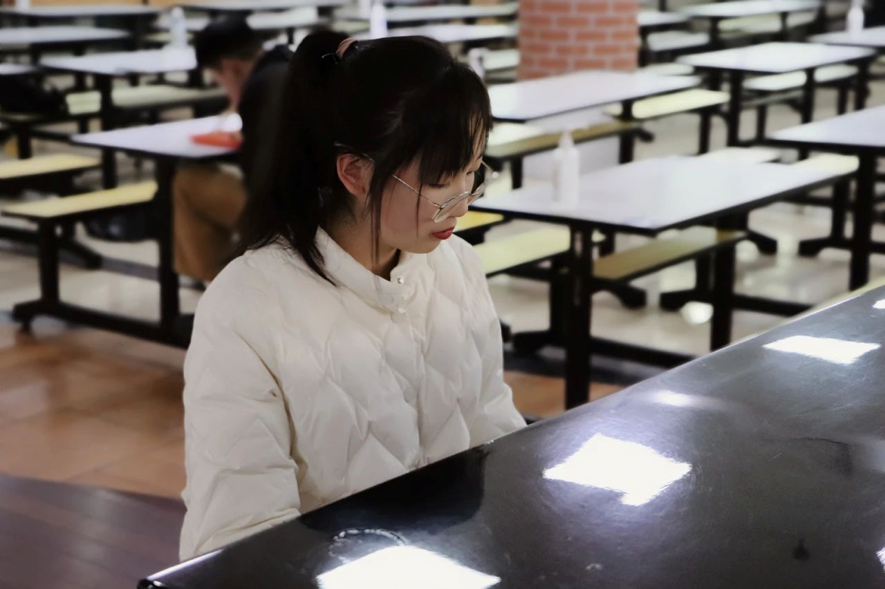 第一次坐上食堂的钢琴凳,耳边伴着熙熙攘攘的人流声,她的心情十分忐忑。