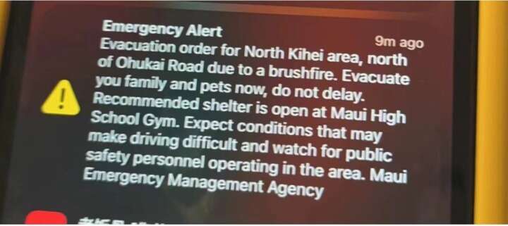 来自江苏的游客小万回忆,其实在她8月7日入住在毛伊岛西北侧的丽思卡尔顿酒店已经有所异常。她的房间在酒店较高楼层,听到大风呼呼作响,几乎将玻璃窗都要吹裂了。与此同时,手机再次跳出警报,“风力比较大,会影响生命财产安全。”