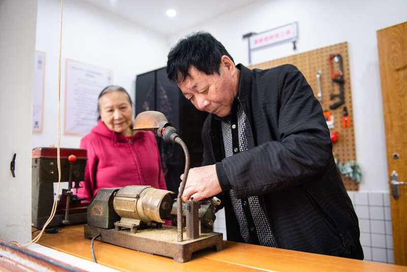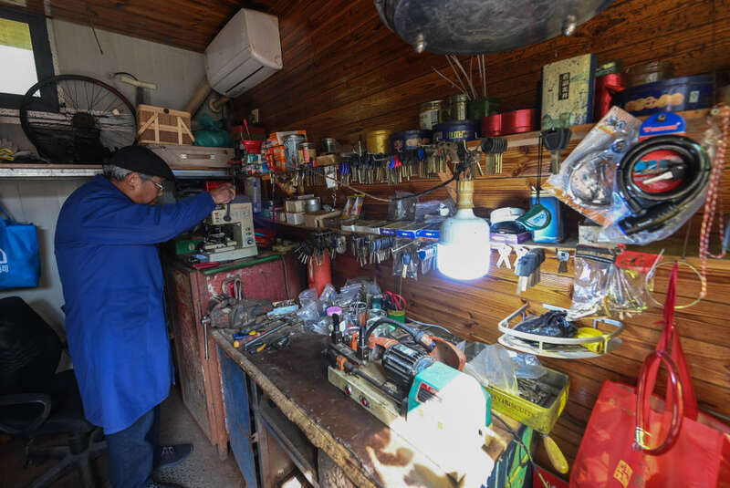 ↑ 2023年2月21日,锁匠在浙江省杭州市富阳区银湖街道高桥社区的便民服务亭内给居民配钥匙。