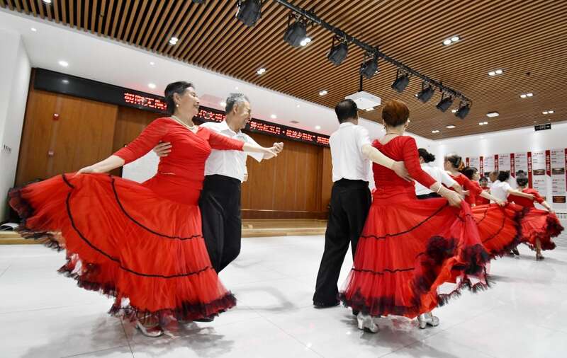 ↑ 2023年5月17日,北京市朝阳区八里庄街道朝阳无限社区的老年人舞蹈队在社区党群活动中心排练舞蹈。