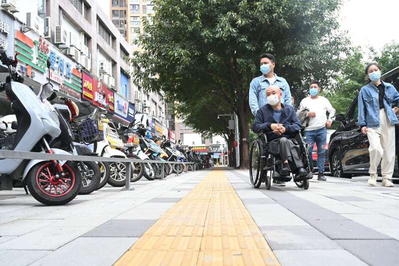 ↑ 2022年11月28日,提升改造后的福建省福州市福瑞社区福机新苑小区周边的盲道铺设一新,车辆停放有序。
