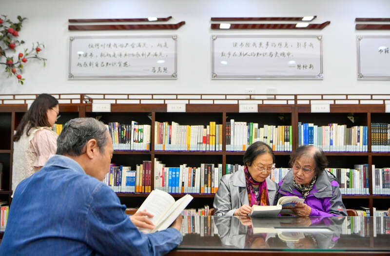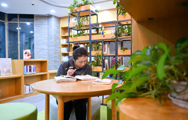 ↑ 2023年4月19日,在天津市河西区新梅江文体中心西岸书斋,读者在阅览室内进行夜间延时阅读。