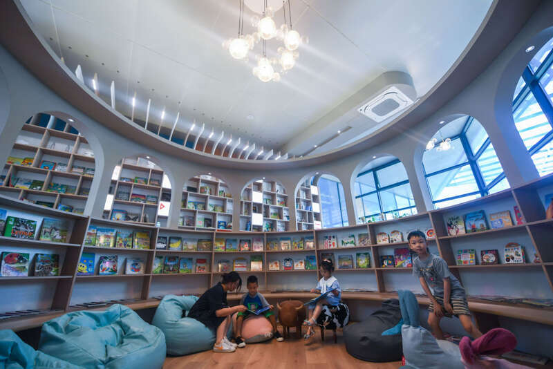 ↑ 2022年7月2日,孩子们在位于浙江省杭州市富阳区银湖街道硅谷社区的“合之舍”书房内看书。