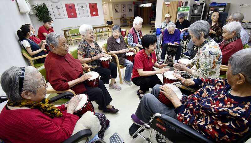 ↑ 2023年5月17日,北京市朝阳区八里庄街道朝阳无限社区的老年人在社区养老驿站学习手鼓演奏。