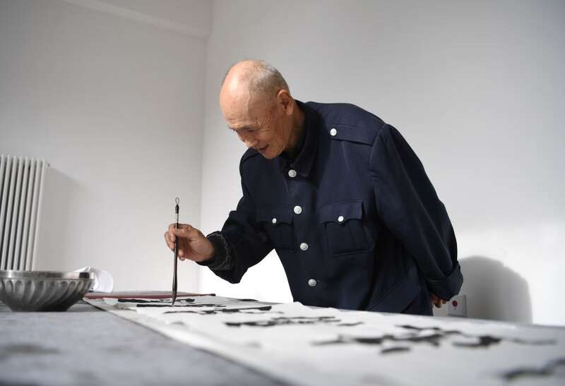 ↑ 2023年5月23日,河北雄安新区容东片区南文营社区居民在社区养老驿站活动室练习书法。