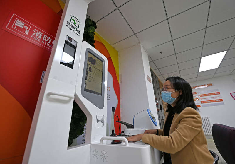 ↑ 2023年2月24日,在天津市滨海新区中新天津生态城第三社区季景兰庭小区,居民在体验设在小区里的“健康e站”。