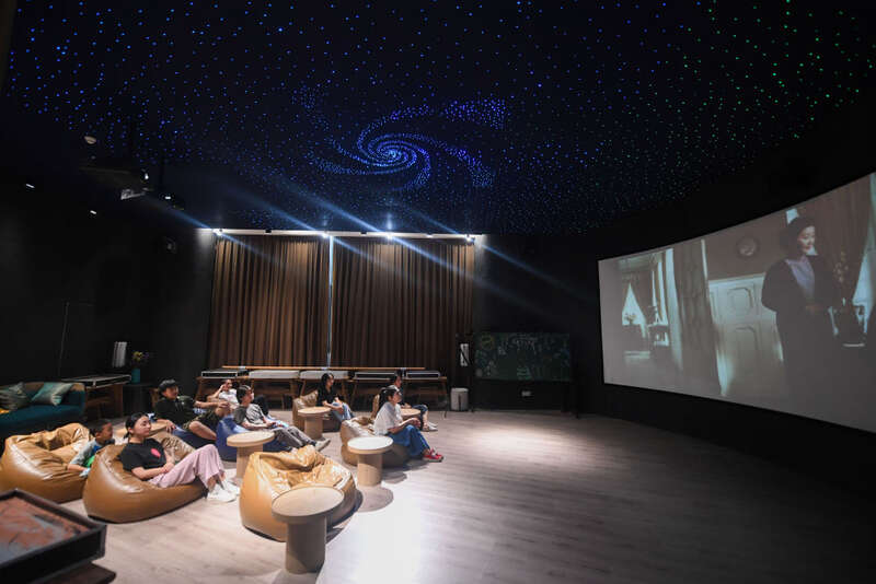 ↑ 2022年7月2日,居民在位于浙江省杭州市富阳区银湖街道硅谷社区的“合之舍”书房的影视厅内观看电影。