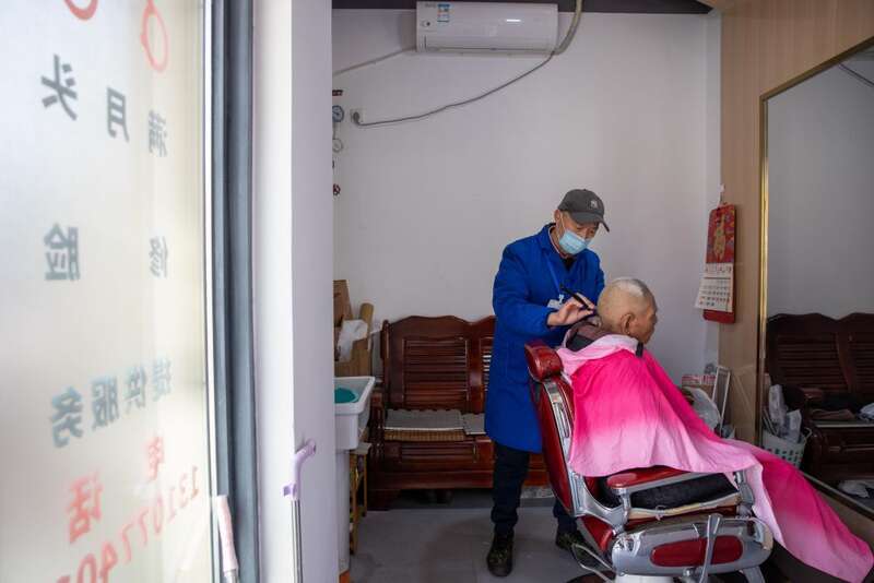 ↑ 2023年2月21日,理发师在浙江省杭州市上城区丁兰街道“幸福格子铺”内为社区居民提供理发服务。
