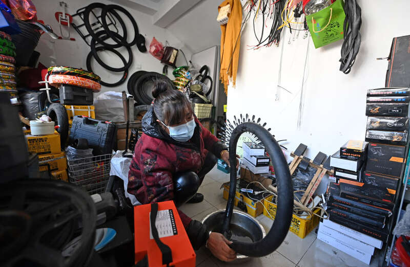 ↑ 2023年2月24日,在天津市滨海新区中新天津生态城第三社区中心,一家自行车修理店经营者正在为顾客检查轮胎。