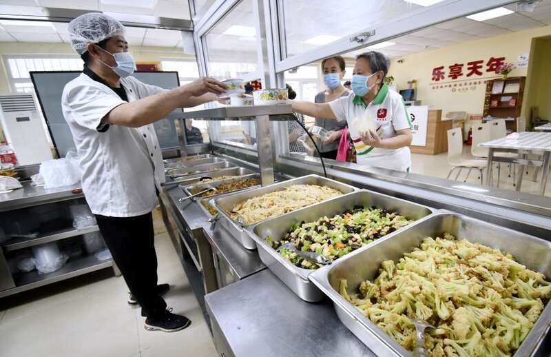 ↑ 2023年5月17日,老人在北京市朝阳区八里庄街道十里堡社区的老年餐厅选购午餐。