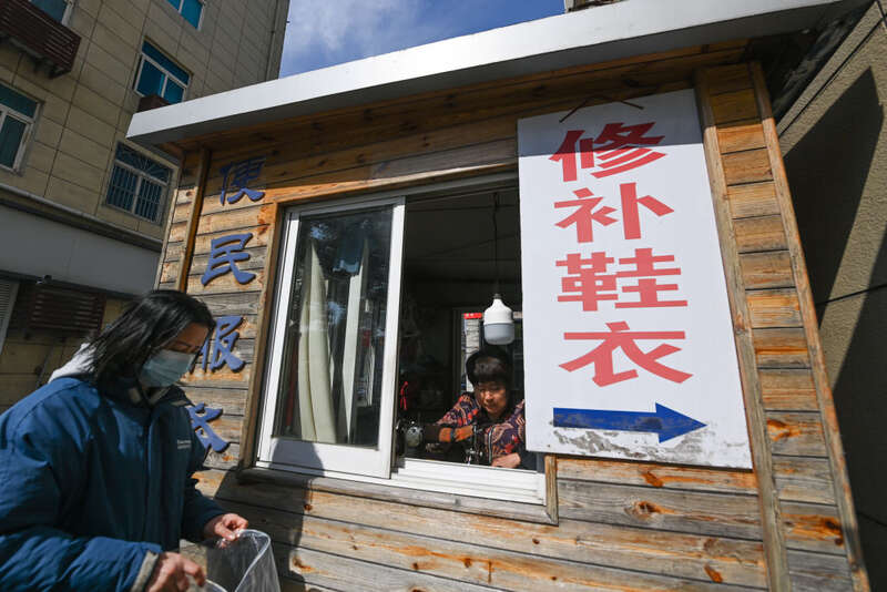 ↑ 2023年2月21日,裁缝师在浙江省杭州市富阳区银湖街道高桥社区的便民服务亭内给居民缝补裤子。