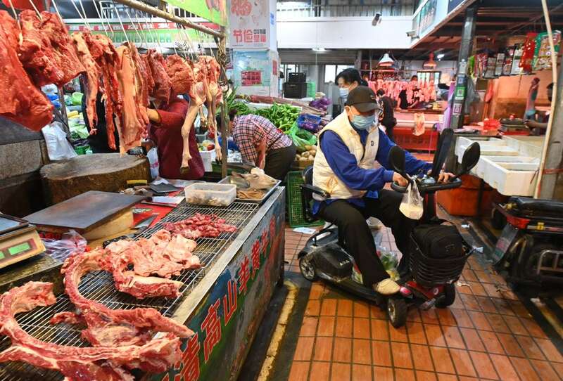 ↑ 2022年11月28日,福建省福州市福瑞社区福机新苑周边的农贸市场进行多坡化改造后,行动不便的老人可以坐着助力车到菜市场买菜。