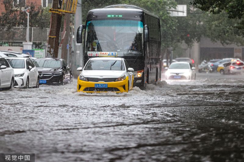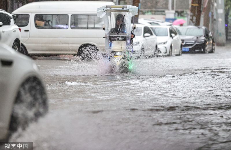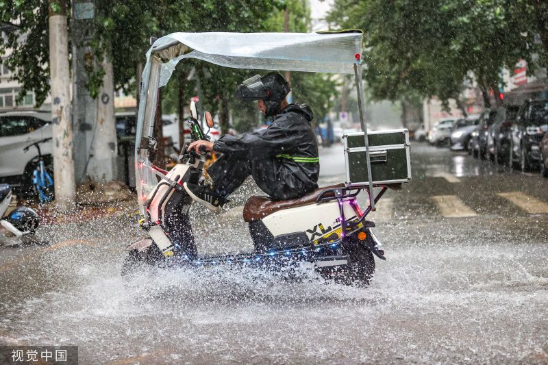 2023年8月12日,沈阳,市民冒大雨出行。当天,受台风“卡努”和高空槽影响,辽宁沈阳发布暴雨蓝色预警。