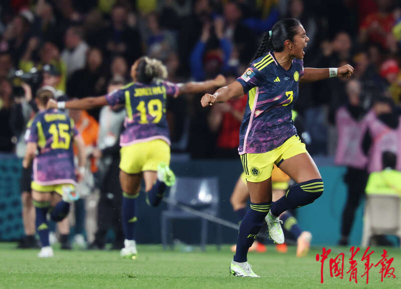 8月12日,澳大利亚悉尼,澳大利亚体育场,2023女足世界杯一场1/4决赛英格兰队对阵哥伦比亚队的比赛中,哥伦比亚队队员庆祝进球。哥伦比亚女足世界排名25,在本届世界杯中表现抢眼,小组赛中先是2比0击败韩国女足,次战2比1绝杀世界排名第二的德国女足,淘汰赛又战胜了牙买加,球队进入八强已经创造历史。刘占崑/摄