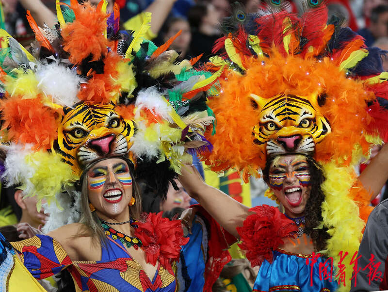 8月12日,澳大利亚悉尼,澳大利亚体育场,2023女足世界杯一场1/4决赛英格兰队对阵哥伦比亚队的比赛中,看台上的哥伦比亚球迷。刘占崑/摄