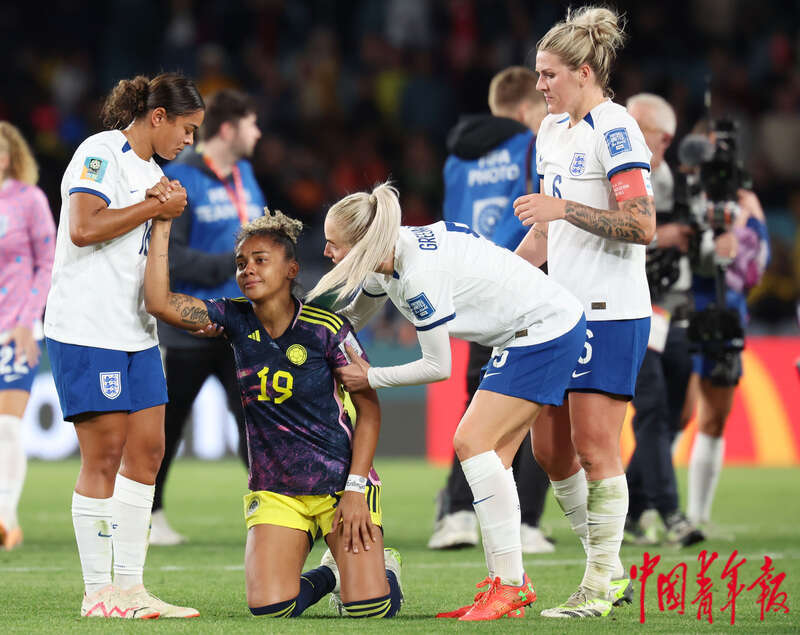 8月12日,澳大利亚悉尼,澳大利亚体育场,2023女足世界杯一场1/4决赛英格兰队对阵哥伦比亚队的比赛中,英格兰队队员安慰伤心的哥伦比亚球员。刘占崑/摄