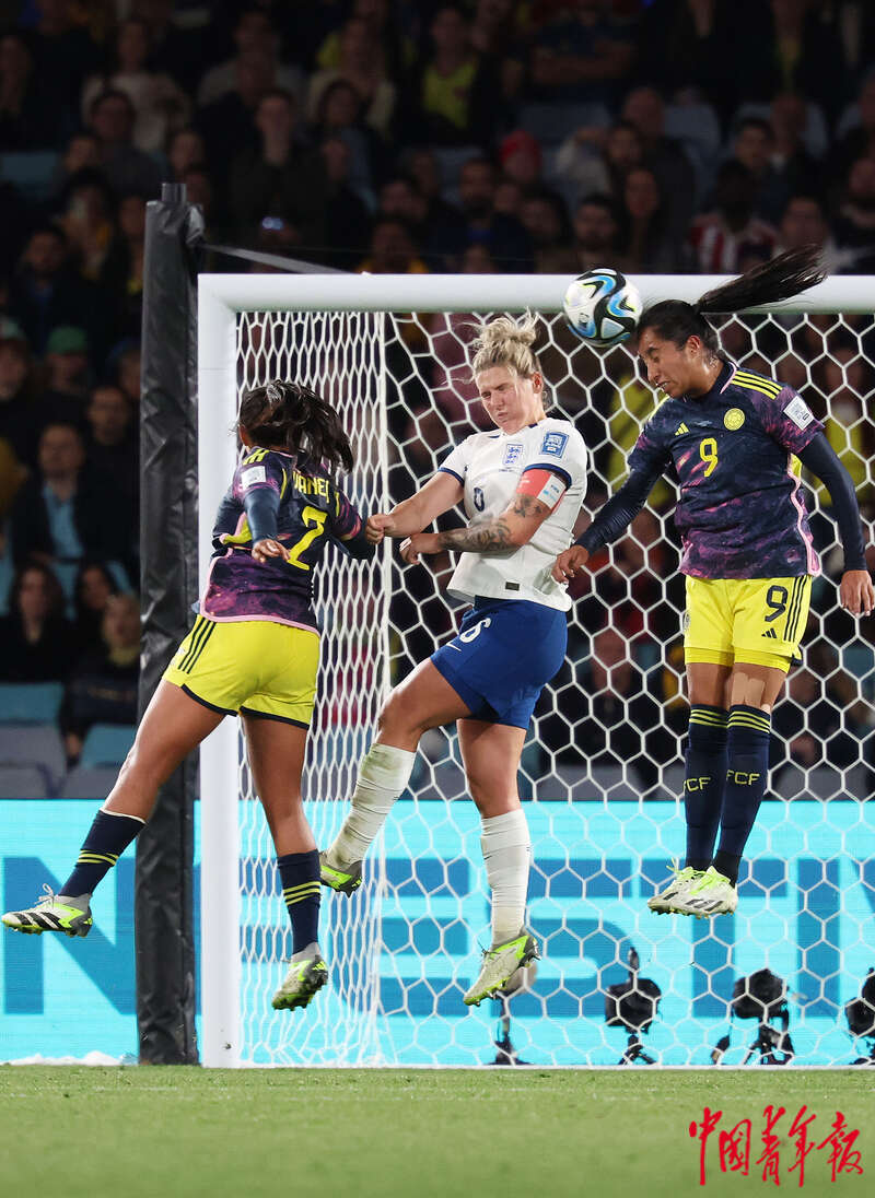 本场比赛对阵双方是英格兰队和哥伦比亚队。本场比赛一开场,双方就展开了激烈的拼争。哥伦比亚队不畏强敌,敢打敢拼,在第44分钟由10号桑托斯打出一脚世界波,取得1比0领先。在上半场补时阶段,哥伦比亚门将卡塔利娜·佩雷斯扑球失误,英格兰队11号亨普跟上捅射入网扳平比分。下半场,英格兰乘胜追击,23号阿莱西娅·拉索抽射破门扩大比分。最终,英格兰队以2比1战胜哥伦比亚队,晋级4强。1/2决赛中,英格兰队将对阵东道主澳大利亚队。刘占崑/摄