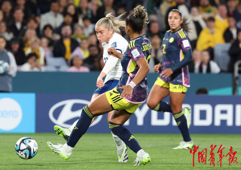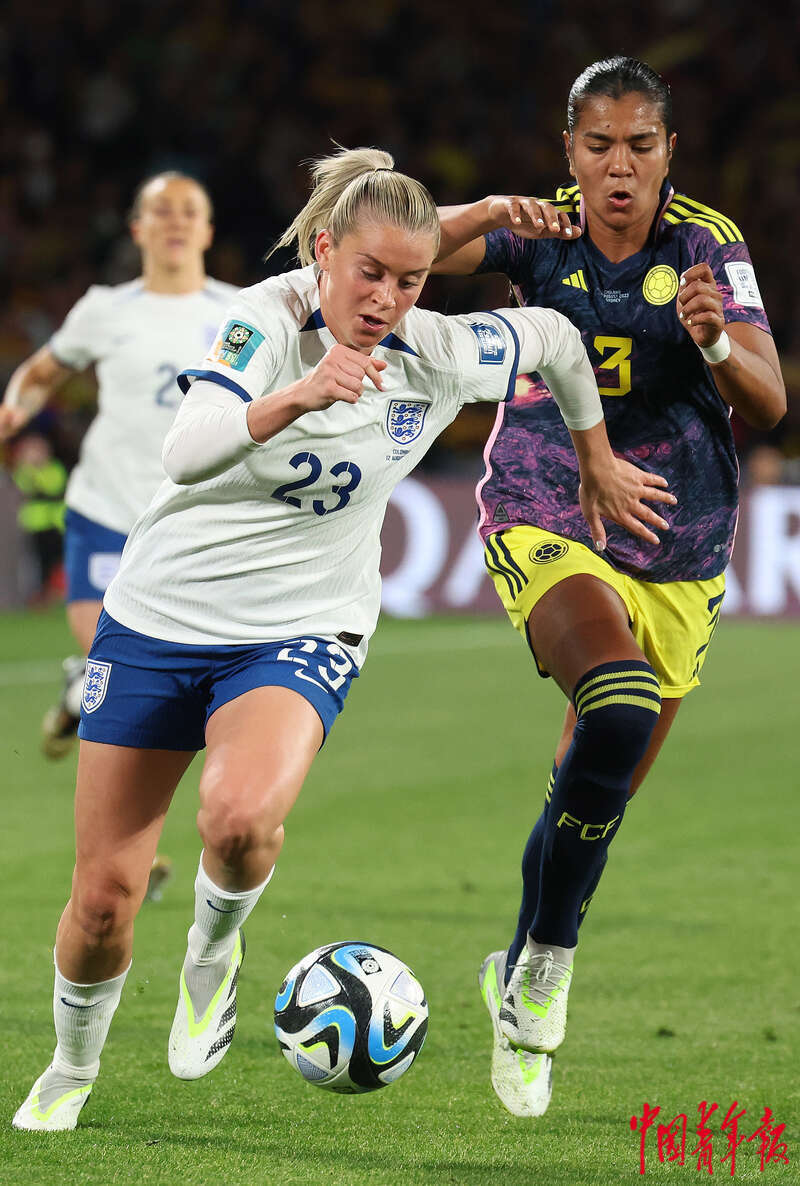 8月12日,澳大利亚悉尼,澳大利亚体育场,2023女足世界杯一场1/4决赛英格兰队对阵哥伦比亚队的比赛中,英格兰队8号斯坦韦与哥伦比亚2号巴内加斯争抢。刘占崑/摄