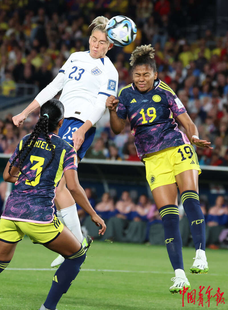 8月12日,澳大利亚悉尼,澳大利亚体育场,2023女足世界杯一场1/4决赛英格兰队对阵哥伦比亚队的比赛中,英格兰队23号阿莱西娅与对方争头球。刘占崑/摄