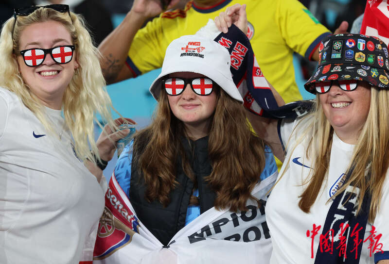 8月12日,澳大利亚悉尼,澳大利亚体育场,2023女足世界杯一场1/4决赛英格兰队对阵哥伦比亚队的比赛中,看台上的英格兰女球迷。刘占崑/摄