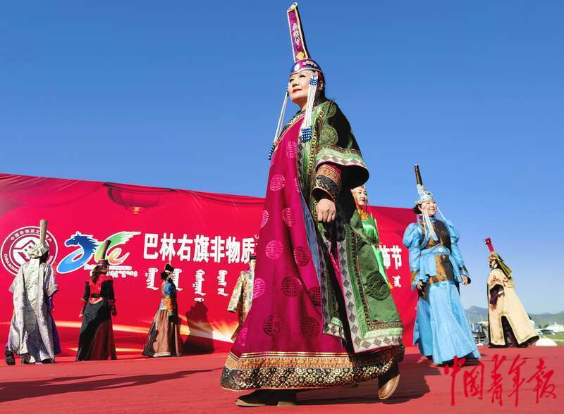 8月6日,内蒙古赤峰市首届乌兰牧骑艺术展演暨巴林右旗第二十四届那达慕大会开幕式上的民族服装展示。此次那达慕大会在为期3天的会期里还将同时举行第十九届巴林石文化节、巴林特色产品展销会、第四届巴林美食节、巴林右旗非物质文化遗产展暨服装服饰节等系列活动。李庚伟/摄