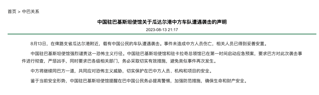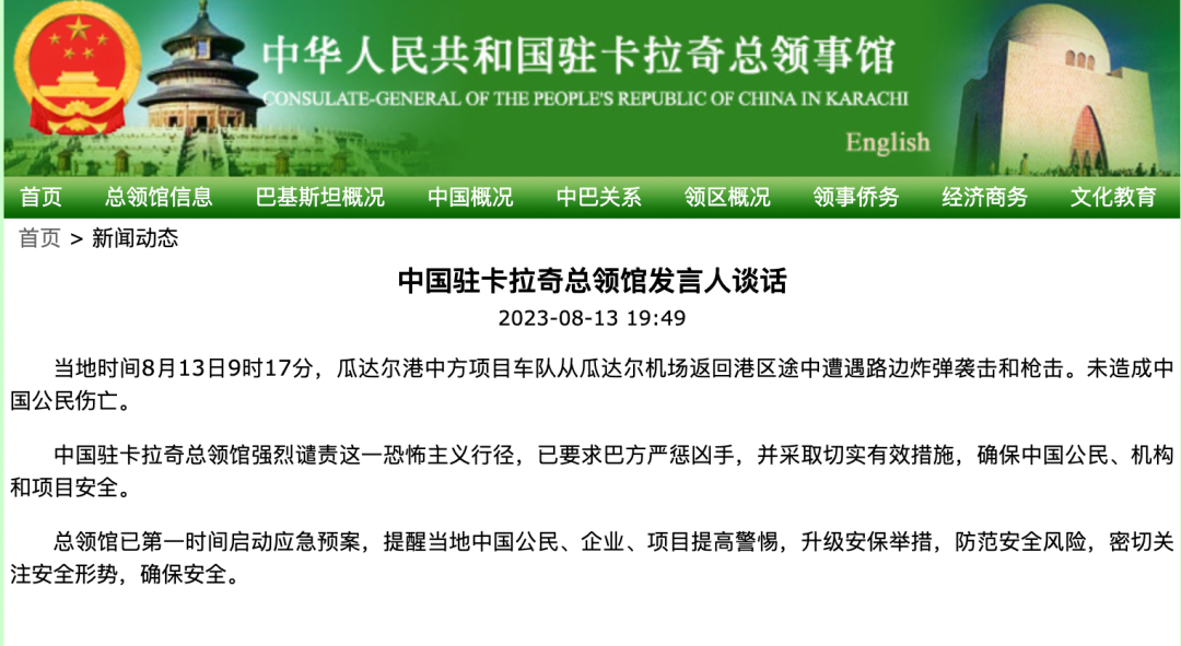 8月13日19时许,中国驻卡拉奇总领馆发布消息称,当地时间8月13日9时17分,瓜达尔港中方项目车队从瓜达尔机场返回港区途中遭遇路边炸弹袭击和枪击。未造成中国公民伤亡。
